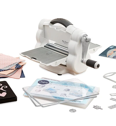Ausklappbare Maschine von Sizzix, gebrauchsfertig und platzsparend! Das Starterset enthält, außer der Maschine selbst, ein ansprechendes zusätzliches Überraschungspaket: 10 Thinlits 1 Bigz Die 1 Life Handmade Papierblock -10 Bögen, doppelseitig (15,24 x 13,97 cm) 4 St. Life Handmade Felt (15,24 x 13,97 cm), 100% sanfter Synthetikfilz 4 St. Life Handmade Fabrics (15,24 x 13,97 cm), Stoffe