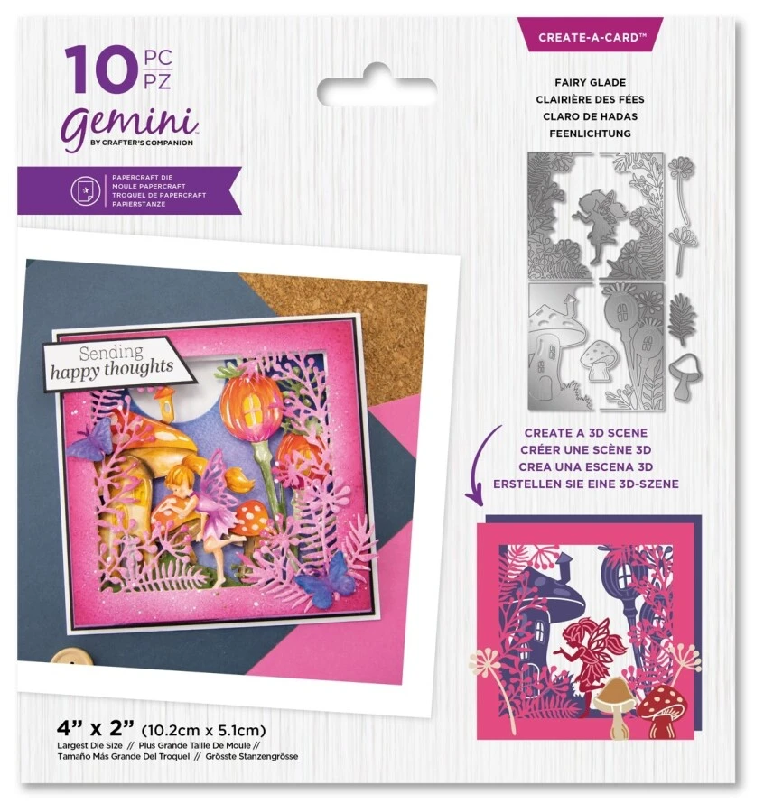 Das Fairy Glade-Set enthält 10 Stanzformen, um einen geschichteten Rahmen aus Wildblumen, verzauberten Pflanzen und einem Pilzhaus mit einer niedlichen Fee und Pilzdekorationen in der Mitte zu erstellen.